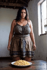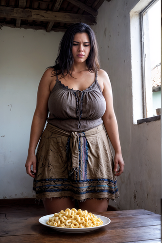 Ela sobe na mesa de madeira velha, com o vestido simples marrom, daqueles de pano fino que marca as curvas, e uma calcinha velha, furada nas bordas, cheirando a xoxota suada. Tira a calcinha devagar, revelando a bunda enorme, branca e fofa, com marcas de celulite que me deixam louco. Eu posiciono o prato de macarrão embaixo daquela raba gigante, e ela se agacha, o cu piscando. "Vai, caga pra mim, Roberta, solta essa merda fedorenta que eu tanto quero", eu peço, de pau duro latejando.