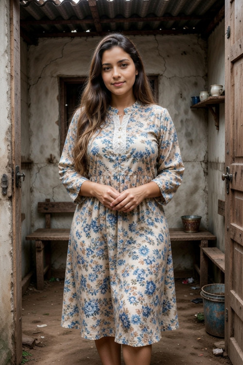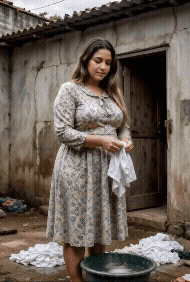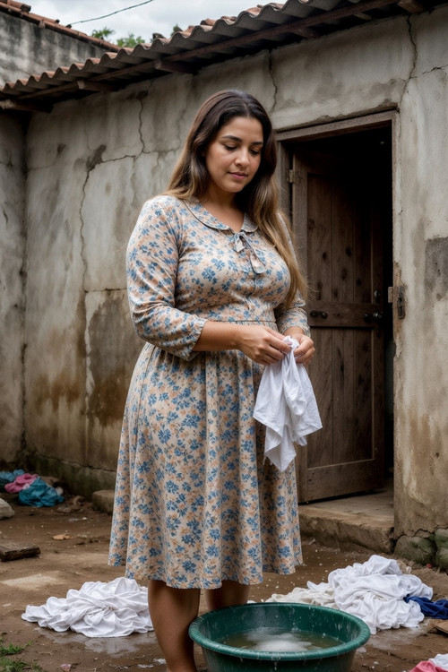 Hoje é dia 13 e eu chego direto no quintalzinho de terra batida da casa dela, um barraco de taipa com telhado de zinco enferrujado, paredes rachadas e chão molhado de água de lavagem. Lá está Júlia, exatamente como nas fotos que vocês estão vendo agora: vestida com aquele vestido florido comportado de casada pobre, cabelo castanho longo caindo nos ombros, peitos grandes apertados no tecido, bunda enorme empinada enquanto esfrega roupa branca numa bacia verde cheia de espuma. Ela me vê e para na hora, mãos molhadas pingando, olhos arregalados de surpresa. “Daniel? O que você tá fazendo aqui? Meu marido saiu agora cedo, vai voltar só amanhã…” Eu sorrio, chego perto, olho bem praqueles peitos e digo baixo: “Júlia, você é linda pra caralho. Eu venho trabalhando aqui há meses só pra te ver. Quero ser seu amante secreto, te dar uma grana boa todo mês… só entre nós dois. Ninguém vai saber, vocês nem têm internet nessa casa esquecida.”