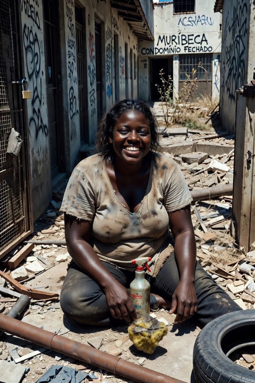 Comecei com fotos simples: ela encostada na parede, sorrindo, depois de cócoras perto do entulho, o borrifador na mão como se fosse pose. Ela relaxou, riu, fez careta. O calor lá dentro era insuportável, o suor escorrendo pelo pescoço dela, molhando a camiseta cinza que grudava nos peitos pesados.