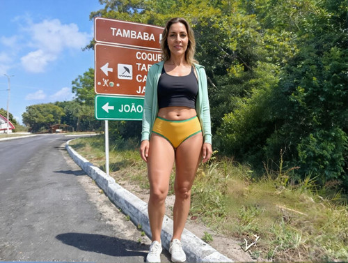Puta que pariu, imagina só: eu toda safada posando naquela estrada quente do litoral sul da Paraíba, bundão suado brilhando no sol, calcinha amarela fio dental enterrada no rabo marcando cada curva, jaqueta verdinha aberta mostrando a barriga tanquinho e a buceta já molhada, bem na frente daqueles placas de Tambaba, Coqueirinho, Tabatinga, Carapibus, Jacumã e a verde apontando pra João Pessoa, sorrindo pra foto enquanto meu corno Manuel filma babando, e logo ali atrás das árvores começa a maior foda coletiva da minha vida com quatro machos me arrombando todos os buracos ao mesmo tempo... se você já tá com o pau latejando só de ler isso, segura firme porque o resto vai te fazer gozar sem nem tocar, quer ver as fotos e vídeos? Então vem devagar que eu conto tudo agora.