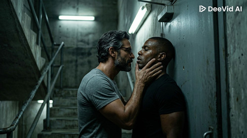 Leo ajoelhou. O concreto mordeu seus joelhos. Gui baixou a calça tectel até os joelhos. O pau já meio duro, grosso, escuro, uma veia pulsando. Leo abriu a boca. Gui colocou a mão em sua nuca.