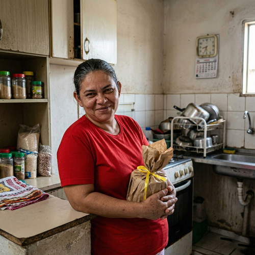 Cheguei num sábado de calor infernal, com o pacote na mão — exatamente aquele embrulhado em papel pardo com laço amarelo que ela aparece segurando na foto da cozinha, sorriso tímido, camisa vermelha justa marcando os peitos. Ela me recebeu na sala, mas logo fomos pra cozinha. Eu já estava de perfume bom, camisa aberta, cheirando a macho que sabe o que quer.