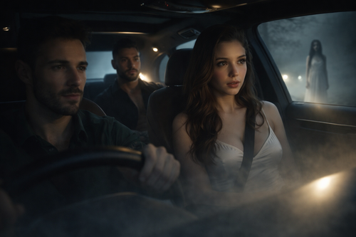 De pé na berma, iluminada apenas pelos faróis, uma jovem vestida de branco. Vestido longo, quase etéreo, cabelo escuro caindo solto sobre os ombros pálidos. Pele muito branca, como porcelana antiga que nunca tinha visto o sol. Estava imóvel, como se esperasse por eles há séculos, os olhos perdidos na neblina.