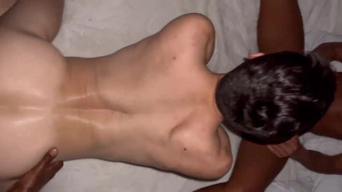 Eles me viraram de lado. Júnior deitado atrás, perna minha por cima da dele, metendo de conchinha enquanto Marcelo enfiava na boca. Depois me colocaram de quatro de novo, mas agora com a câmera do celular ligada (eu pedi). Júnior meteu no cu, Marcelo meteu também. Dupla penetração bruta. Dois pauzões tentando entrar juntos no meu buraco rosado. Meu cu esticou ao máximo, ardendo, doendo pra porra, mas eu gozei sem tocar no pau, jatos grossos sujando o lençol enquanto gritava: