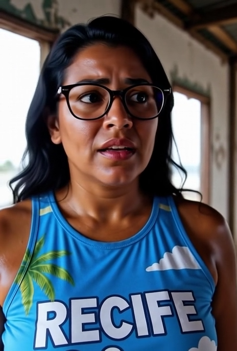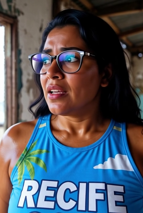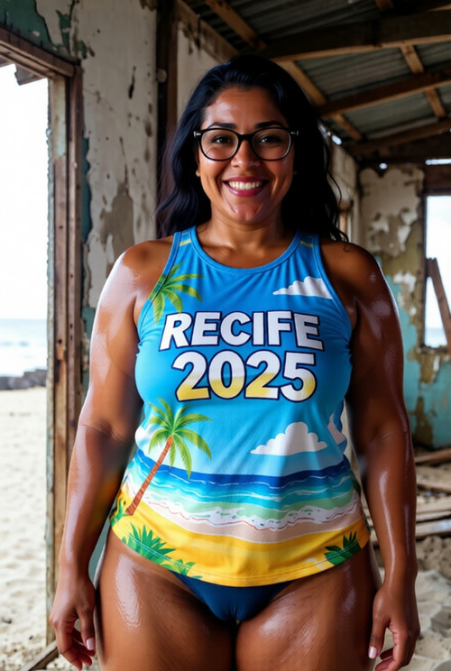 Mas a história não para aí. Hoje, marcamos de novo às 12h nessa mesma casa abandonada. O marido dela deve estar bêbado no churrasco com os amigos, rindo e bebendo enquanto eu fodo a esposa dele de novo. Chego cedo, o sol do meio-dia torrando tudo, e espero encostado na parede, meu pau já meia-bomba só de lembrar ontem. O cheiro do mar invade o barracão, misturado com o mofo antigo, e eu ouço passos na areia. Jane aparece, usando uma blusa tank top azul com estampa de "Recife 2025", palmeiras e praia, que gruda nos peitos suados, e um shortinho amarelo e azul que mal cobre a bunda. Seus óculos embaçados pelo calor, cabelos soltos, pele brilhando de óleo que ela deve ter passado pra me provocar.