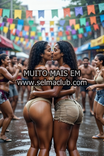 Mas o ápice vem no Carnaval. Depois do Natal, voltamos para Recife, e no Carnaval de rua em Olinda, a multidão pulando, chuva caindo, bandeiras coloridas balançando. Elas vestem shorts curtos e tops, corpos suados da dança. No meio da rua encharcada, elas se abraçam, beijando-se apaixonadamente, bundas roçando. "Vem, mana, vamos foder aqui no meio da bagunça", diz Sofia, puxando Elisa para um beco próximo, mas ainda visível. Eu sigo, filmando.